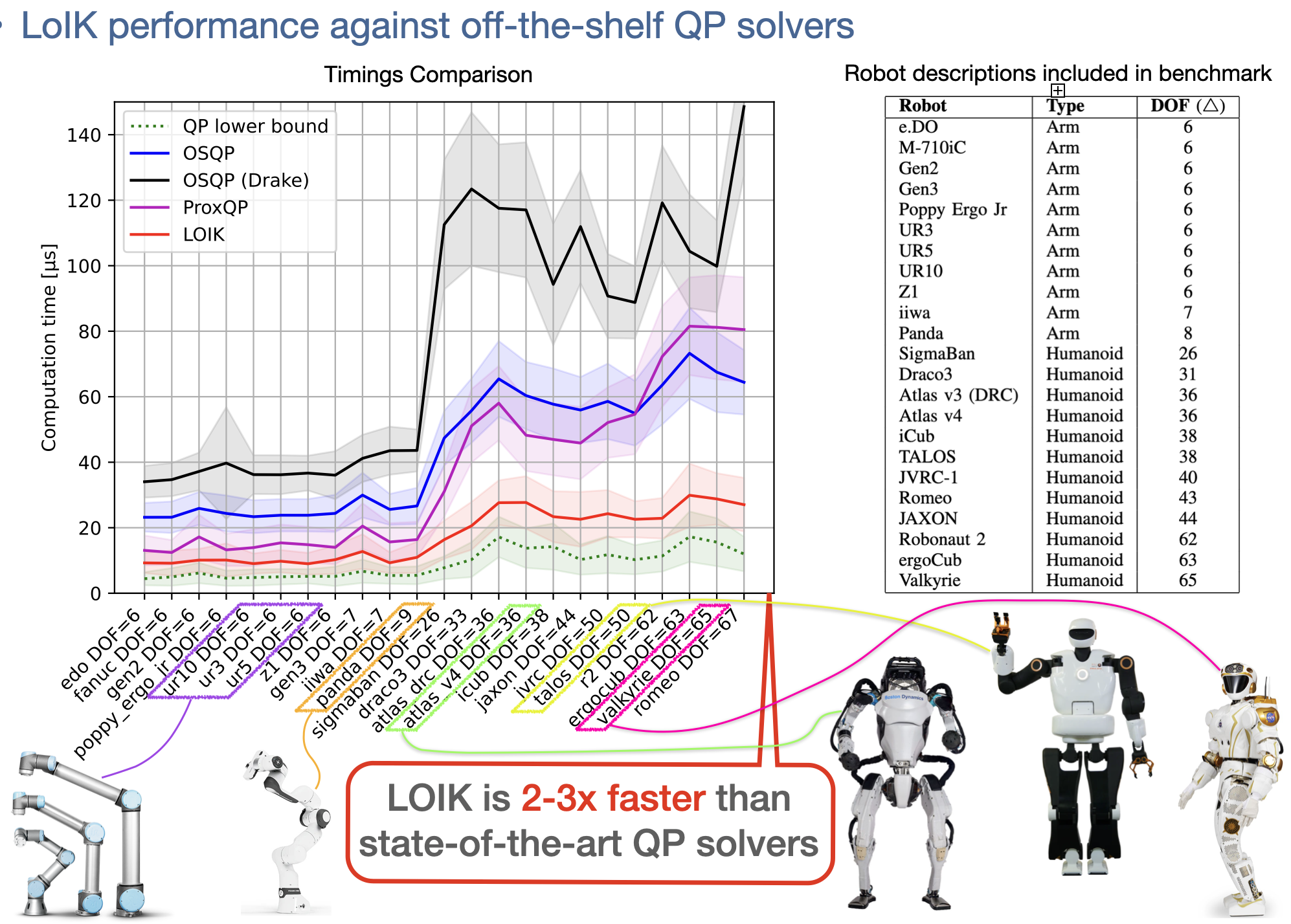 I introduced a novel constrained differential inverse kinematics solver that reframes the problem from an Augmented Lagrangian perspective. The resulting solver, LoIK, achieves linear-time complexity in both the total degrees-of-freedom of the robot, and the number of constraints in the problem. The low time-complexity makes it suitable for real-time control and planning of complex systems like humanoid robots with multiple equality/inequality constraints. As shown in the benchmarks, LoIK consistently outperforms the state-of-the-art, general-purpose quadratic programming solvers. This work was published in Robotics: Science and Systems (RSS) 2024. Pre-print available here. The open-source solver is available on GitHub.